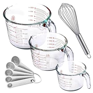 Bakeware, Kitchen & DiningSet of 3 Glass Measuring Cups with Measuring Spoons & Whisk – Kitchen Mixing Bowl Liquid Measure Cup, Glass Bakeware. 1 cup, 2 cup, 4 cup.