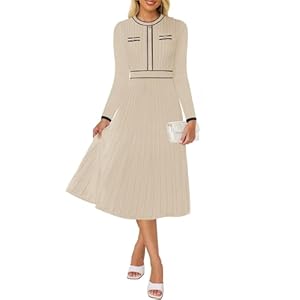 ZESICA Women’s Spring Pleated Sweater Dress Long Sleeve Crewneck Ribbed Knitted Midi Dresses