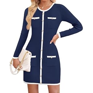 ZESICA Fall Dresses for Women 2025 Long Sleeve Button Color Block Knit Bodycon Short Sweater Dresses with Pockets