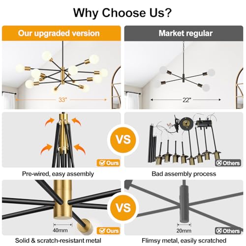【Easy Installation】This chandeliers for dining room features pre-wired frames that does not require much assembly—just simply connect the rods and arms! Our modern chandelier includes all necessary components and comes with clear, easy-to-follow instructions for a smooth, hassle-free installation process.