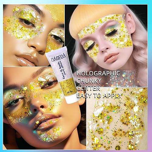 DAGEDA Body Glitter Gel, Face Glitters Body Gel Sequins Shimmer Liquid Eyeshadow, Chunky Glitter for Face Hair Nails, Holographic Cosmetic Laser Powder Festival Glitter Makeup 50ml(Gold)