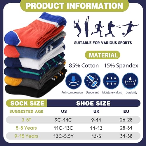 EBMORE 6 Pairs Kids Boys Socks Athletic Basketball Sport Breathable Crew Soft Cotton Youth Socks for Outdoor