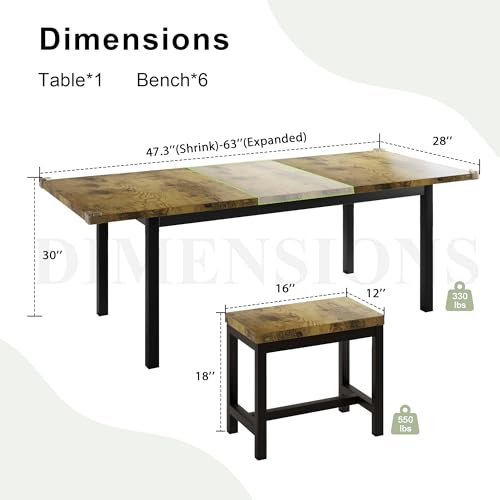 7-Piece Dining Table Set: Table dimensions in inches: 63″L x 28″W x 30″H(extended), stool: 42″L x 12″W x 18″H. Weight capacity: table: 330lb, stool: 550lb