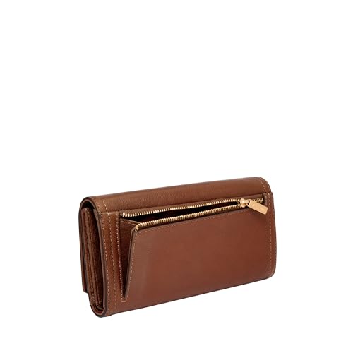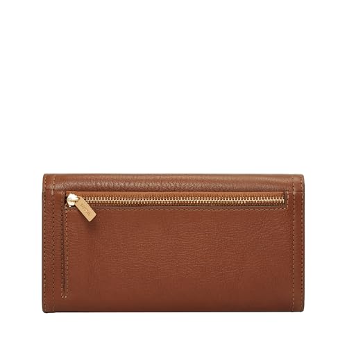 The Fossil Logan Flap Clutch is crafted in leather with polyurethane trim and features a fold-over flap with snap closure, rear exterior zip pocket, and brand name foil embossed at the front.