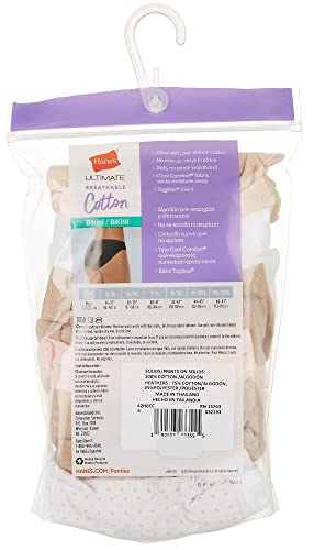 Hanes Ultimate® cotton bikini panties are one of the best basic bikinis you can buy. These lightweight cotton bikinis have a low-rise silhouette with moderate back coverage and high-cut legs for the longer, leaner look so many women love. This cotton bikini underwear is made with Hanes® Cool Comfort® fabric that wicks away moisture from your skin to keep you cool and dry all day. Plus the cotton is preshrunk which means the size you buy is the size they stay, wash after wash. You’ll also appreciate the ultra-soft waistband that won’t pinch or bind and leg bands that stay comfortably in place without riding up. These cool cotton bikini panties are available in a convenient 6-pack of assorted solids and prints.