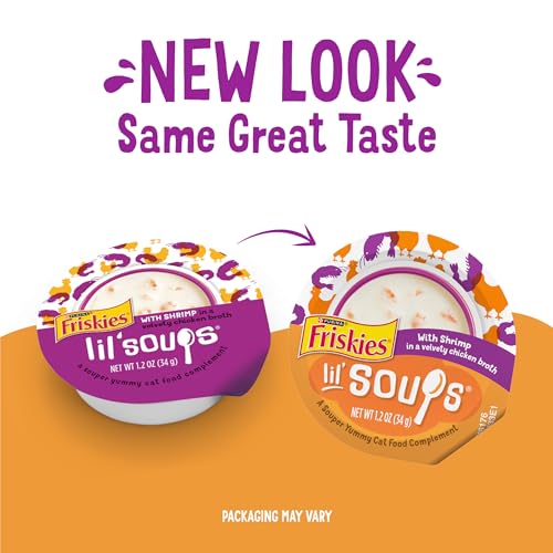 Bring on more playful antics at snack time with your cat when you serve Purina Friskies Lil’ Soups With Shrimp in a Velvety Chicken Broth adult wet cat food complement. This mouthwatering recipe features real chicken, shrimp and other high-quality ingredients for a wholesome way to satisfy her cravings between meals. The savory, velvety broth brings added flavor and moisture to every delectable nibble, creating a scrumptious food experience that’s sure to keep her happily licking her paws. Intended as a complement to her complete and balanced daily diet, this delightful snack gives you a fun way to treat her to something special. Let your favorite feline know just how much you enjoy spending time with her when you fill her dish with this Purina Friskies Lil’ Soups adult wet cat food complement, and feel good about serving her a product backed by a trusted brand. Getting the quality cat food your pet deserves only take a few clicks when you order Purina Friskies from Amazon.com
