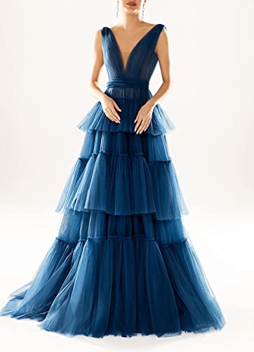 Women’s Double V-Neck Prom Dresses Long 2025 Tiered Tulle A-line Pleated Formal Party Gowns