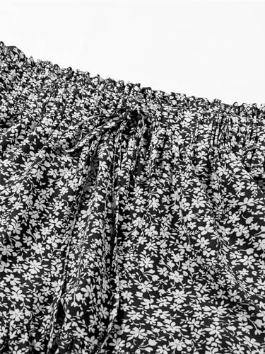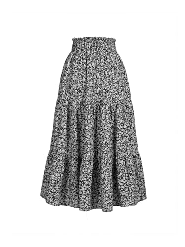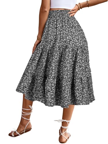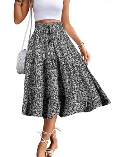Women’s High Elastic Waist Midi Skirt Casual Summer Trendy Tie Front Flowy Ruffle Floral Print A line Skirts 626