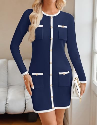 ZESICA Fall Dresses for Women 2025 Long Sleeve Button Color Block Knit Bodycon Short Sweater Dresses with Pockets
